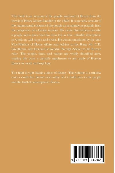 This book is an account of the people and land of Korea from the travels of Henry Savage-Landor in the 1880s. It is an early account of the manners and customs of the people as accurately as possible from the perspective of a foreign traveler. His astute observations describe a people and a place that has been lost in time, valuable descriptions in words, as well as pen and brush. He was accomodated by the then Vice-Minister of Home Affairs and Adviser to the King, Mr. C.R. Greathouse, also General Le Gendre, Foreign Adviser to the Korean ruler. The culture, times and culture is vividly described here, making this work a valuable supplement to any study of Korean culture or history.