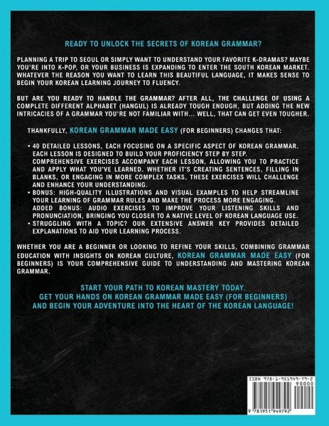 Ready to unlock the secrets of Korean grammar? Planning a trip to Seoul or simply want to understand your favorite K-dramas? Maybe you're into K-pop, or your business is expanding to enter the South Korean market. Whatever the reason you want to learn this beautiful language, it makes sense to begin your Korean learning journey to fluency. But are you ready to handle the grammar? After all, the challenge of using a completely different alphabet (Hangul) is already tough enough, but adding the intricacies of a grammar you're not familiar with can get even tougher. In this book: 40 detailed lessons, each focusing on a specific aspect of Korean grammar. From '¿¿ (Greetings)' to '¿¿¿¿ (Sentence endings)', each lesson is designed to build your proficiency step by step. Comprehensive exercises accompany each lesson, allowing you to practice and apply what you've learned. Whether it's creating sentences, filling in blanks, or engaging in more complex tasks, these exercises will challenge and enhance your understanding. BONUS: High-quality illustrations and visual examples to help streamline your learning of grammar rules and make the process more engaging. ADDED BONUS: Audio exercises to improve your listening skills and pronunciation, bringing you closer to a native level of Korean language use. Struggling with a topic? Our extensive answer key provides detailed explanations to aid your learning process. Whether you are a beginner or looking to refine your skills, combining grammar education with insights on Korean culture, Korean Grammar Made Easy is your comprehensive guide to understanding and mastering Korean grammar. Start your path to Korean mastery today. Get your hands on Korean Grammar Made Easy and begin your adventure into the heart of the Korean language!