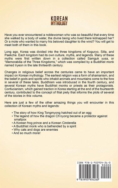 Have you ever encountered a noblewoman who was so beautiful that every time she walked by a body of water, the divine being who lived there kidnapped her? Or a mole who wanted to marry his beloved daughter to the wind? You will get to meet both of them in this book. Long ago, Korea was divided into the three kingdoms of Koguryo, Silla, and Paekche. Each kingdom had its own culture, myths, and legends. Many of these myths were first written down in a collection called Samguk yusa, or "Memorabilia of the Three Kingdoms," which was compiled by a Buddhist monk named Iryeon in the late thirteenth century. Changes in religious belief across the centuries came to have an important impact on Korean mythology. The earliest religion was a form of shamanism, and the belief in gods and spirits who inhabit animals and mountains come to the fore in several of these tales. Buddhism was introduced in the fourth century, and several Korean myths have Buddhist monks or priests as their protagonists. Confucianism, which gained traction in Korea starting at the end of the fourteenth century, contributed to the concept of filial piety that informs the plots of several of the stories in this volume. Some of these myths involve high-status people such as kings and government officials, or else tell of the activities of divine beings such as heavenly maidens or dragons, while others are amusing tales about the doings of cats and dogs and other animals. Myths such as "The Legend of Tangun" explain how kingdoms were founded, while "Kot'aji and the God of the Western Sea" tell the tale of how the archer Kot'aji saved a dragon and his family from the predations of a malicious demon, while other dragon stories are about people needing to be rescued from their long, scaly hosts who, despite having snatched people away from their families, are largely benignant beings who treat their guests well. Here are just a few of the other amazing things you will encounter in this collection of Korean myths and legends:The story of how King Tongmyong hatched out of an egg The legend of how the dragon Ch'oyong became a protector against smallpox A Korean frog prince and a Korean Cinderella A Buddhist monk who is befriended by a spirit The good brother whom the King of the Swallows rewards for his kindness, and the bad brother who learns a hard lesson about selfishness Why cats and dogs are enemies And more! Scroll up and click the "add to cart" button to learn more about Korean myths and legends.
