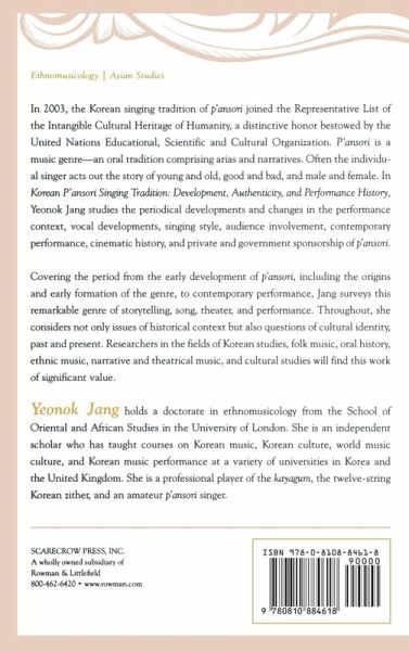 In Korean P'ansori Singing Tradition: Development, Authenticity, and Performance History, Yeonok Jang studies the periodical developments and changes in the performance context, vocal developments, singing style, audience involvement, contemporary performance, cinematic history, and private and government sponsorship of p'ansori.