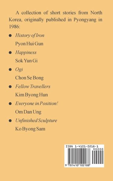 A collection of short stories from North Korea, originally published in Pyongyang in 1986: History of Iron Pyon Hui Gun Happiness Sok Yun Gi Ogi Chon Se Bong Fellow Travellers Kim Byong Hun Everyone in Position! Om Dan Ung Unfinished Sculpture Ko Byong Sam