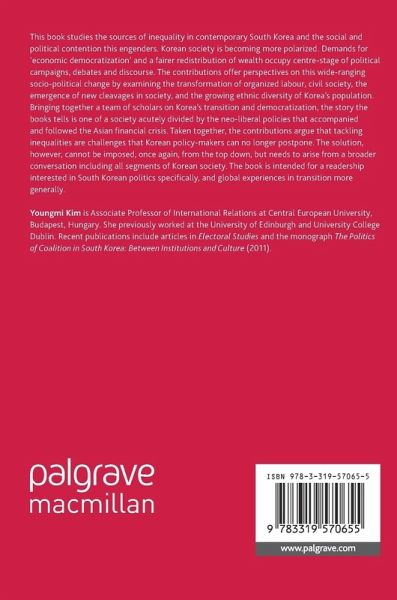 This book studies the sources of inequality in contemporary South Korea and the social and political contention this engenders. Korean society is becoming more polarized. Demands for 'economic democratization' and a fairer redistribution of wealth occupy centre-stage of political campaigns, debates and discourse. The contributions offer perspectives on this wide-ranging socio-political change by examining the transformation of organized labour, civil society, the emergence of new cleavages in society, and the growing ethnic diversity of Korea's population. Bringing together a team of scholars on Korea's transition and democratization, the story the books tells is one of a society acutely divided by the neo-liberal policies that accompanied and followed the Asian financial crisis. Taken together, the contributions argue that tackling inequalities are challenges that Korean policy-makers can no longer postpone. The solution, however, cannot be imposed, once again, from the top down, but needs to arise from a broader conversation including all segments of Korean society. The book is intended for a readership interested in South Korean politics specifically, and global experiences in transition more generally.