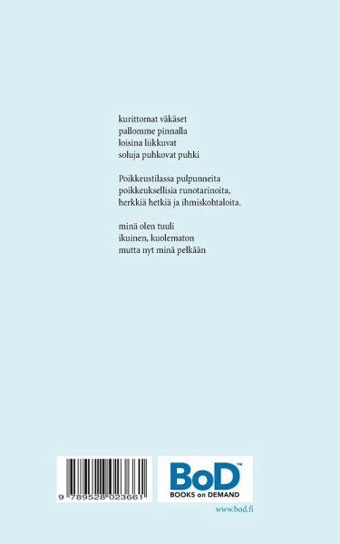 kurittomat väkäset pallomme pinnalla loisina liikkuvat soluja puhkovat puhki Poikkeustilassa pulpunneita poikkeuksellisia runotarinoita, herkkiä hetkiä ja ihmiskohtaloita. minä olen tuuli ikuinen, kuolematon mutta nyt minä pelkään