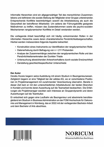 Informelle Hierarchien sind ein allgegenwärtiger Teil des menschlichen Zusammen- lebens und definieren die soziale Stellung der Mitglieder einer Gruppe untereinan- der. Entsprechende Konflikte beeinträchtigen sowohl die Arbeitsleistung als auch die Gesundheit der betroffenen Mitarbeiter. Um seitens der Führungskräfte geeig- nete Maßnahmen zu treffen, müssen das Zustandekommen sowie die psycho- sozialen Mechanismen rangdynamischer Konflikte im Detail verstanden werden.Die vorliegende Arbeit beschäftigt sich mit häufig vorkommenden Rollen in der informellen Hierarchie sowie deren charakteristische Persönlichkeitseigenschaften. Hierbei werden insbesondere folgende Aspekte betrachtet:- Konstruktion eines Instruments zur Identifikation der rangdynamischen Rolle- Datenerhebung durch Befragung von n = 211 Probanden- Analyse der Zusammenhänge zwischen der rangdynamischen Rolle und den Persönlichkeitsmerkmalen der Dunklen Triade- Untersuchung abweichenden Antwortverhaltens durch soziale Erwünschtheit- Darstellung geschlechtsspezifischer Unterschiede