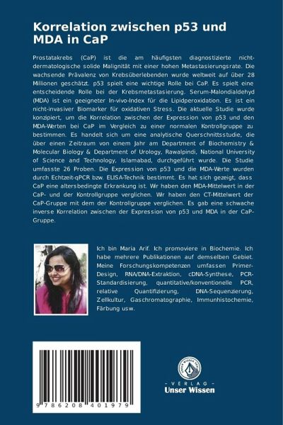 Prostatakrebs (CaP) ist die am häufigsten diagnostizierte nicht-dermatologische solide Malignität mit einer hohen Metastasierungsrate. Die wachsende Prävalenz von Krebsüberlebenden wurde weltweit auf über 28 Millionen geschätzt. p53 spielt eine wichtige Rolle bei CaP. Es spielt eine entscheidende Rolle bei der Krebsmetastasierung. Serum-Malondialdehyd (MDA) ist ein geeigneter In-vivo-Index für die Lipidperoxidation. Es ist ein nicht-invasiver Biomarker für oxidativen Stress. Die aktuelle Studie wurde konzipiert, um die Korrelation zwischen der Expression von p53 und den MDA-Werten bei CaP im Vergleich zu einer normalen Kontrollgruppe zu bestimmen. Es handelt sich um eine analytische Querschnittsstudie, die über einen Zeitraum von einem Jahr am Department of Biochemistry & Molecular Biology & Department of Urology, Rawalpindi, National University of Science and Technology, Islamabad, durchgeführt wurde. Die Studie umfasste 26 Proben. Die Expression von p53 und die MDA-Werte wurdendurch Echtzeit-qPCR bzw. ELISA-Technik bestimmt. Es hat sich gezeigt, dass CaP eine altersbedingte Erkrankung ist. Wir haben den MDA-Mittelwert in der CaP- und der Kontrollgruppe verglichen. Wir haben den CT-Mittelwert der CaP-Gruppe mit dem der Kontrollgruppe verglichen. Es gab eine schwache inverse Korrelation zwischen der Expression von p53 und MDA in der CaP-Gruppe.