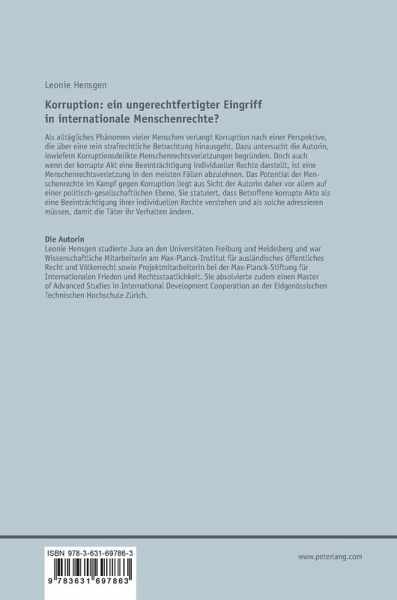 Als alltägliches Phänomen vieler Menschen verlangt Korruption nach einer Perspektive, die über eine rein strafrechtliche Betrachtung hinausgeht. Dazu untersucht die Autorin, inwiefern Korruptionsdelikte Menschenrechtsverletzungen begründen. Doch auch wenn der korrupte Akt eine Beeinträchtigung individueller Rechte darstellt, ist eine Menschenrechtsverletzung in den meisten Fällen abzulehnen. Das Potential der Menschenrechte im Kampf gegen Korruption liegt aus Sicht der Autorin daher vor allem auf einer politisch-gesellschaftlichen Ebene. Sie statuiert, dass Betroffene korrupte Akte als eine Beeinträchtigung ihrer individuellen Rechte verstehen und als solche adressieren müssen, damit die Täter ihr Verhalten ändern.