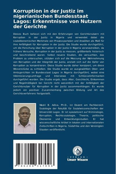 Dieses Buch befasst sich mit den Erfahrungen von Gerichtsnutzern mit Korruption in der Justiz in Nigeria und verwendet dabei die sozioökonomischen Merkmale von Prozessparteien und Anwälten als Maß für ihre Anfälligkeit für Korruption in der Justiz. Die Studie wurde durchgeführt, um die Forschung über Korruption in der Justiz in Nigeria voranzutreiben, da frühere Versuche, Korruption in der Justiz zu messen, größtenteils historisch und beschreibend waren. Selbst neuere Studien, die versuchten, das Problem zu untersuchen, stützten sich auf die Messung der Wahrnehmung von Korruption und der Integrität der Justiz, anstatt sich auf die Opfer von Korruption zu konzentrieren. Diese Studie wurde daher konzipiert, um diese Wissenslücke zu schließen. Die Studie wurde an ausgewählten Ober- und Amtsgerichten im Bundesstaat Lagos in Nigeria durchgeführt, wobei eine Viktimisierungsumfrage und Interviews mit Schlüsselinformanten durchgeführt wurden. Die Studie ergab, dass Alter, Geschlecht, Einkommen und Regelmäßigkeit bei Gericht nicht wesentlich mit der Anfälligkeit der Gerichtsnutzer für Korruption in der Justiz zusammenhängen. Es wurde jedoch ein positiver Zusammenhang zwischen Bildung und Art des Gerichtsverfahrens festgestellt.