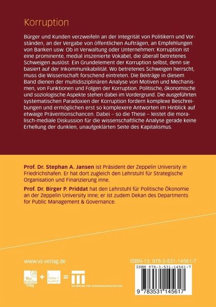 Wo betretenes Schweigen herrscht, muss die Wissenschaft forschend eintreten. Die Beiträge in diesem Band dienen der multidisziplinären Analyse von Motiven und Mechanismen, von Funktionen und Folgen der Korruption. Politische, ökonomische und soziologische Aspekte stehen dabei im Vordergrund. Die ausgeführten systematischen Paradoxien der Korruption fordern komplexe Beschreibungen und ermöglichen erst so komplexere Antworten im Hinblick auf etwaige Präventionschancen. Dabei - so die These- leistet die moralisch-mediale Diskussion für die wissenschaftliche Analyse gerade keine Erhellung der dunklen, unaufgeklärten Seite des Kapitalismus.