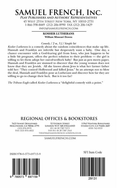 Comedy / Characters: 2m, 3f / Unit Set Kosher Lutherans centers on Hanna and Franklyn, the seemingly perfect couple who desperately want to have a child of their own, but are unable to do so. As the couple begins to wonder if they'll ever become parents, they have a chance encounter with a God-fearing pregnant girl from Iowa who offers to let the couple adopt her out-of-wedlock baby. Just before the adoption papers are signed, Hanna and Franklyn discover the girl is unaware that they are Jewis