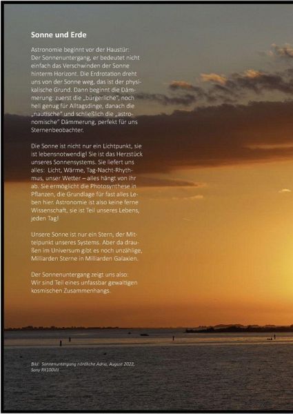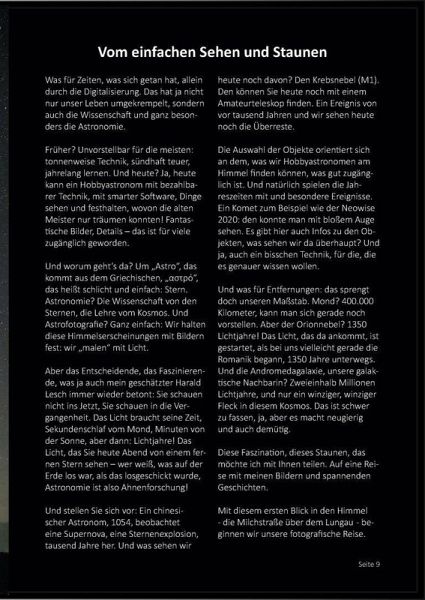 Begleiten Sie den Autor, er nimmt Sie mit auf eine fotografische Reise durch dieses unfassbare Universum! Mit eigenen Bildern, die zeigen, was da draußen los ist! Ein bisschen ein Blick hinter die Kulissen der Astrofotografie. Und das Wichtigste: leicht verständliche Erklärungen astronomischer und historischer Zusammenhänge; wir reden auch über die großen Fragen. Ein Erlebnis für Sterngucker und alle, die sich vom Kosmos einfach nur verzaubern lassen wollen.