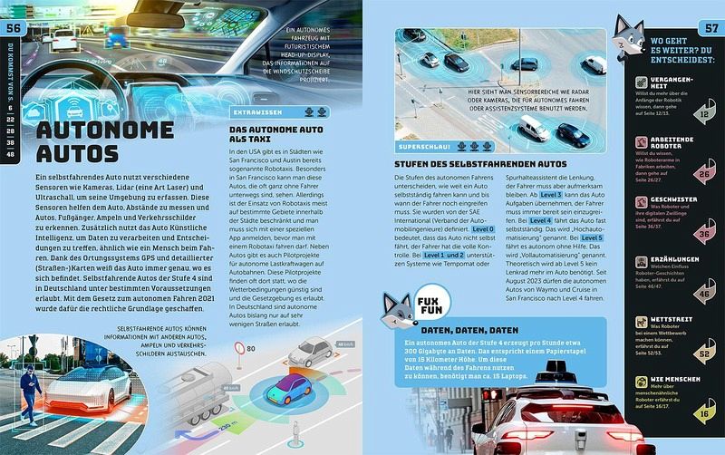 Interessant, aber letztlich nicht überzeugend fand ich die „Navigation“ des Buches. Jede Doppelseite stellt ein Kapitel dar, in dem ein Aspekt zum Thema Roboter und KI behandelt wird. Dabei gibt es über das Buch verteilt sieben Themenschwerpunkte, die mittels Farbcode gekennzeichnet sind. Am linken und rechten Rand jeder Doppelseite befindet sich ein „Navigationsmenü“, mit dem man zu passenden Folgekapiteln vor- oder zurückspringen kann. Wahrscheinlich wollte man hier die Browser-Navigation im Internet nachempfinden. Anfänglich fand ich die Idee noch originell. Der Nachteil ist jedoch: Wenn man das Buch „normal“ durchblättert, ist die Aneinanderreihung der Kapitel willkürlich und nicht aufeinander aufbauend.