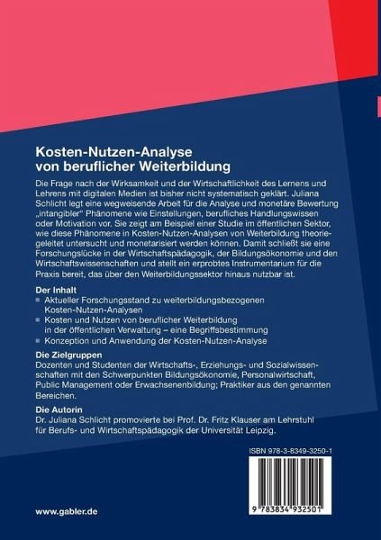 Die Frage nach der Wirksamkeit und der Wirtschaftlichkeit des Lernens und Lehrens mit digitalen Medien ist bisher nicht systematisch geklärt. Juliana Schlicht legt eine wegweisende Arbeit für die Analyse und monetäre Bewertung "intangibler" Phänomene wie Einstellungen, berufliches Handlungswissen oder Motivation vor. Sie zeigt am Beispiel einer Studie im öffentlichen Sektor, wie diese Phänomene in Kosten-Nutzen-Analysen von Weiterbildung theoriegeleitet untersucht und monetarisiert werden können. Damit schließt sie eine Forschungslücke in der Wirtschaftspädagogik, der Bildungsökonomie und den Wirtschaftswissenschaften und stellt ein erprobtes Instrumentarium für die Praxis bereit, das über den Weiterbildungssektor hinaus nutzbar ist.