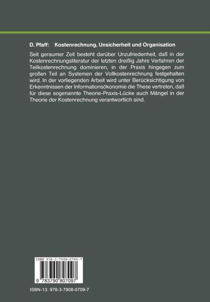 Seit geraumer Zeit besteht in Theorie und Praxis Unzufriedenheit darüber, daß in der Kostenrechnungsliteratur der letzten dreißig Jahre Verfahren der Teilkostenrechnung dominieren. Die Praxis aber hält zum großen Teil an Systemen der Vollkostenrechnung fest. In der vorliegenden Arbeit wird die These vertreten, daß für diese sog. Theorie-Praxis-Lücke auch Mängel in der Theorie verantwortlich sind. Im einzelnen wird gezeigt, daß sich die Beurteilung von Systemen der Voll- und Teilkostenrechnung beim Übergang von einer sicheren auf eine unsichere Welt sowie beim Übergang von einem zentralistischen Unternehmen mit nur einem Entscheider und vollkommener Information auf ein Unternehmen mit dezentraler Organisationsstruktur und Informationsasymmetrie grundlegend ändern kann. Ferner wird dargelegt, welche Rolle in diesem Kontext konkrete Zurechnungsverfahren - wie z.B. das Durchschnitts- und Tragfähigkeitsprinzip - spielen können. Dabei ergeben sich auch Konsequenzen für die Kostenrechnung und die Kostenrechnungstheorie, beispielsweise für die Interpretation des Verursachungsprinzips.