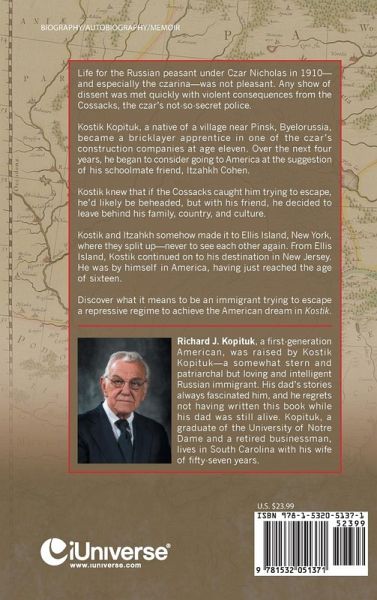 Life for the Russian peasant under Czar Nicholas in 1910-and especially the czarina-was not pleasant. Any show of dissent was met quickly with violent consequences from the Cossacks, the czar's not-so-secret police. Kostik Kopituk, a native of a village near Pinsk, Byelorussia, became a bricklayer apprentice in one of the czar's construction companies at age eleven. Over the next four years, he began to consider going to America at the suggestion of his schoolmate friend, Itzahkh Cohen. Kostik knew that if the Cossacks caught him trying to escape, he'd likely be beheaded, but with his friend, he decided to leave behind his family, country, and culture. Kostik and Itzahkh somehow made it to Ellis Island, New York, where they split up-never to see each other again. From Ellis Island, Kostik continued on to his destination in New Jersey. He was by himself in America, having just reached the age of sixteen. Discover what it means to be an immigrant trying to escape a repressive regime to achieve the American dream in Kostik.