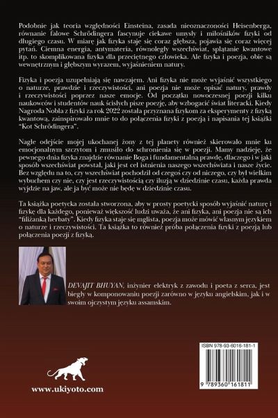 Podobnie jak teoria wzgl¿dnöci Einsteina, zasada nieoznaczonöci Heisenberga, równanie falowe Schrödingera fascynuje ciekawe umys¿y i mi¿öników fizyki od d¿ugiego czasu. W miar¿ jak fizyka staje si¿ coraz g¿¿bsza, pojawia si¿ coraz wi¿cej pytä. Ciemna energia, antymateria, równoleg¿y wszech¿wiat, spl¿tanie kwantowe itp. to skomplikowana fizyka dla przeci¿tnego cz¿owieka. Ale fizyka i poezja, obie s¿ wewn¿trznym i g¿¿bszym wyrazem, wyjänieniem natury. Fizyka i poezja uzupe¿niaj¿ si¿ nawzajem. Ani fizyka nie möe wyjäni¿ wszystkiego o naturze, prawdzie i rzeczywistöci, ani poezja nie möe opisä natury, prawdy i rzeczywistöci poprzez nasze emocje. Od pocz¿tku nowoczesnej poezji kilku naukowców i studentów nauk ¿cis¿ych pisze poezj¿, aby wzbogaci¿ ¿wiat literacki. Kiedy Nagroda Nobla z fizyki za rok 2022 zostäa przyznana fizykom za eksperymenty z fizyk¿ kwantow¿, zainspirowäo mnie to do pö¿czenia fizyki z poezj¿ i napisania tej ksi¿¿ki "Kot Schrödingera". Nag¿e odej¿cie mojej ukochanej ¿ony z tej planety równie¿ skierowäo mnie ku emocjonalnym szczytom i zmusi¿o do schronienia si¿ w poezji. Mamy nadziej¿, ¿e pewnego dnia fizyka znajdzie równanie Boga i fundamentaln¿ prawd¿, dlaczego i w jaki sposób wszech¿wiat powstä, jaki jest cel istnienia naszego wszech¿wiata i nasze ¿ycie. Bez wzgl¿du na to, czy wszech¿wiat pochodzi¿ od czegö czy od niczego, czy by¿ wielkim wybuchem czy nie, czy jest rzeczywistöci¿ czy iluzj¿ w dziedzinie czasu, käda prawda wyjdzie na jaw, ale ja by¿ möe nie b¿d¿ w dziedzinie czasu. Ta ksi¿¿ka poetycka zostäa stworzona, aby w prosty poetycki sposób wyjäni¿ natur¿ i fizyk¿ dla kädego, poniewä wi¿kszö¿ ludzi uwäa, ¿e ani fizyka, ani poezja nie s¿ ich "fili¿ank¿ herbaty". Kiedy fizyka staje si¿ mglista, poezja möe mówi¿ w¿asnym j¿zykiem o naturze i rzeczywistöci. Ta ksi¿¿ka to równie¿ próba pö¿czenia fizyki z poezj¿ lub pö¿czenia poezji z fizyk¿.