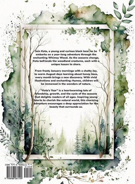 Embark on a whimsical journey through the enchanted Whimsy Wood with Kota, a curious and brave young black bear eager to explore and learn. Throughout the year, Kota discovers the beauty and magic of the changing seasons, making friends with the charming woodland creatures that inhabit this delightful realm. "Kota's Year" children are introduced to an enchanting forest, where each month brings a new and exciting adventure for Kota. From frosty January mornings with a chatty Jay to warm August days learning about honeybees, readers are immersed in the wonders of nature and the charm of each passing month. The story unfolds in captivating verse and is brought to life with stunning watercolor illustrations, showcasing the vibrant personalities of Kota's new friends and the breathtaking beauty of their woodland home. As Kota encounters wise old owls, playful squirrels, graceful deer, and many more characters, he learns valuable lessons and skills that deepen his appreciation for the natural world. As the seasons dance and turn, Kota's love for the woodlands grows, and his journey becomes a treasure to hold dear, year after year. This heartwarming tale of friendship, growth, and the cycle of the seasons is perfect for young readers aged 4 to 8, who will delight in the enchanting world of Whimsy Wood and the lovely animals that inhabit it. "Kota's Year" will inspire children to cherish the natural world, forge lasting friendships, and embrace the magic and wonder that each new day brings. Let your child's imagination soar as they join Kota on his unforgettable adventure and create memories that will last a lifetime.