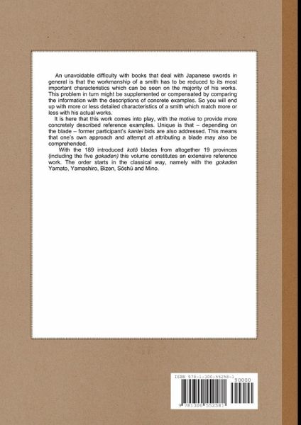 An unavoidable difficulty with books that deal with Japanese swords in general is that the workmanship of a smith has to be reduced to its most important characteristics which can be seen on the majority of his works. It is here that this work comes into play, with the motive to provide more concretely described reference examples. Unique is that - depending on the blade - former participant's kantei bids are also addressed. This means that one's own approach and attempt at attributing a blade may also be comprehended. With the 189 introduced kotô blades from altogether 19 provinces (including the five gokaden) this volume constitutes an extensive reference work. The order starts in the classical way, namely with the gokaden Yamato, Yamashiro, Bizen, Sôshû and Mino.