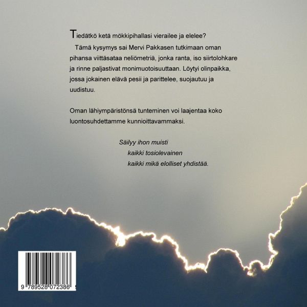 Mitä tiedät mökkipihasi eläjistä? Luonnon moninaisuuden huomioimiseen tarvitsee vain pienen alan, kiinnostuksen ja rohkeuden pysähtyä luonnon tapahtumien äärelle. Näin löytää sellaista, johon ei yleensä kiinnitä huomiota tai jota ei edes halua nähdä. Mervi Pakkanen on kulkenut Sammakon surmasta (1991) Kotokoloon tarkkailemalla ja kuvaamalla oman mökkipihansa viidensadan neliömetrin osaa. Löytyi yhteistä ihmiselle, matelijalle, lentävälle ja maassa vilistävälle, joista jokainen pesii ja parittelee, suojautuu ja uudistuu.