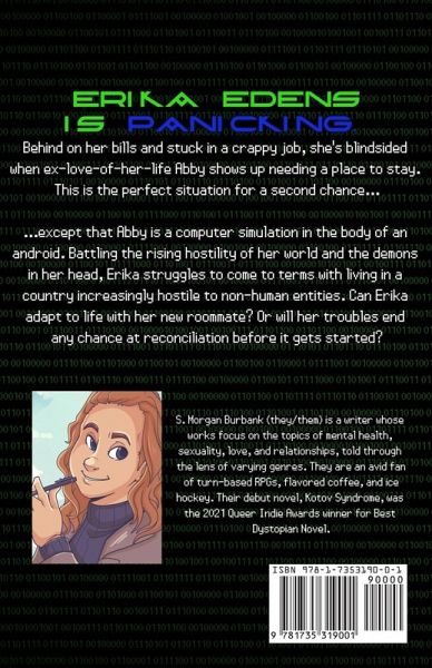 Erika Edens is panicking. Behind on her bills and stuck in a crappy job, she's blindsided when ex-love-of-her-life Abby shows up needing a place to stay. This is the perfect situation for a second chance... ...except that Abby is a computer simulation in the body of an android. Battling the rising hostility of her world and the demons in her head, Erika struggles to come to terms with living in a country increasingly hostile to non-human entities. Can Erika adapt to life with her new roommate? Or will her troubles end any chance at reconciliation before it gets started? Trigger warnings: Alcoholism, anxiety, bigotry, car accident, death, hate crimes, homophobia, intrusive thoughts, mental illness, racism, sexism, strong language, trauma/PTSD, violence