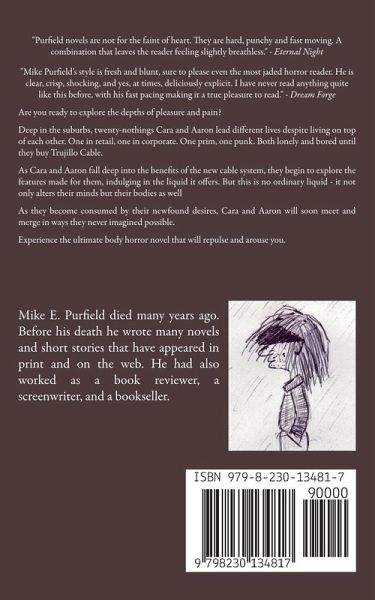 "Purfield novels are not for the faint of heart. They are hard, punchy and fast moving. A combination that leaves the reader feeling slightly breathless." - Eternal Night "Mike Purfield's style is fresh and blunt, sure to please even the most jaded horror reader. He is clear, crisp, shocking, and yes, at times, deliciously explicit. I have never read anything quite like this before, with his fast pacing making it a true pleasure to read." - Dream Forge Are you ready to explore the depths of pleasure and pain? Deep in the suburbs, twenty-nothings Cara and Aaron lead different lives despite living on top of each other. One in retail, one in corporate. One prim, one punk. Both lonely and bored until they buy Trujillo Cable. As Cara and Aaron fall deep into the benefits of the new cable system, they begin to explore the features made for them, indulging in the liquid it offers. But this is no ordinary liquid - it not only alters their minds but their bodies as well. As they become consumed by their newfound desires, Cara and Aaron will soon meet and merge in ways they never imagined possible. Experience the ultimate body horror novel that will repulse and arouse you.