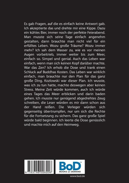 Es gab Fragen, auf die es einfach keine Antwort gab. Ich akzeptierte das und drehte mir eine Kippe. Dazu ein kühles Bier, immer noch der perfekte Feierabend. Man musste sich seine Tage einfach angenehm gestalten, dann brauchte man nicht viel für ein erfülltes Leben. Wozu große Träume? Wozu immer mehr? Ich sah dem Wasser zu, wie es vor meinen Augen vorbeitrieb, immer weiter bis zum Meer, einfach so. Simpel und genial. Auch das Leben war einfach, wenn man sich keinen Kopf darüber machte. War das Zen? Ich erhob die Dose und trank einen Schluck auf Buddhas Kosten. Das Leben war wirklich einfach, man brauchte nur den Plan für das ganz große Ding. Kozlowski war dieser Plan. Ich wusste, was ich zu tun hatte, machte deswegen aber keinen Stress. Meine Zeit würde kommen, auch ich würde eines Tages das Meer erblicken und darin baden gehen. Ich musste nur genügend abgedrehtes Zeug schreiben, die Leser würden es mir dann schon aus der Hand reißen. Die Verleger würden sich gegenseitig übertrumpfen, nur um sich die Rechte für die Fortsetzung zu sichern. Das ganz große Spiel würde bald beginnen. Ich leerte die Dose genüsslich und machte mich auf den Heimweg.