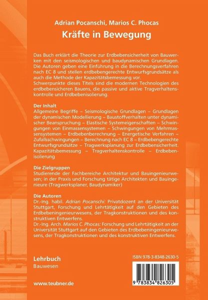 Das Buch erklärt die Theorie zur Erdbebensicherheit von Bauwerken mit allen seismologischen und baudynamischen Grundlagen. Die Autoren erläutern Berechnungsverfahren nach EC 8, stellen erdbebengerechte Entwurfsgrundsätze als auch die Methode der Kapazitätsbemessung vor.