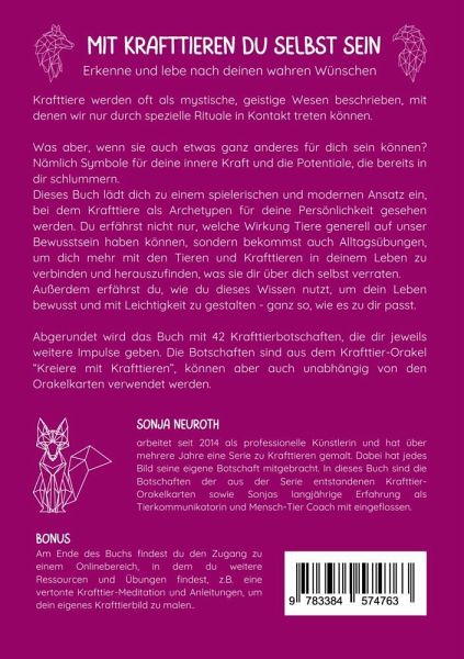 Krafttiere - Deine Inspiration für Selbsterkenntnis und ein Leben nach deinen Wünschen Welches Krafttier begleitet dich? Und was verrät es über dein verborgenes Potential?Krafttiere werden oft als mystische Wesen beschrieben, mit denen man nur durch Rituale oder schamanische Techniken in Kontakt treten kann. Doch was, wenn sie viel direkter zu dir sprechen - als Spiegel deiner inneren Kraft und als Wegweiser zu einem selbstbestimmten Leben?Dieses Buch lädt dich ein, Krafttiere auf eine ganz neue, alltagstaugliche Weise kennenzulernen. Sie stehen hier nicht für ein äußeres Geistwesen, sondern für Archetypen deines Unterbewusstseins - Symbole für die Fähigkeiten und Potenziale, die bereits in dir schlummern. Das erwartet dich in diesem Buch: Entdecke, welche Krafttiere dich begleiten und welche Botschaften sie für dich haben Erfahre, wie Tiere unser Bewusstsein beeinflussen können und welche Rolle sie in deinem Leben spielen Nutze alltagstaugliche Übungen, um dich mit der Energie der Krafttiere zu verbinden und deine persönlichen Potenziale zu entfalten Lass dich von 42 Krafttierbotschaften leiten, die dir weitere Inspirationen für dein Leben bieten. Hierbei sind auch die sogenannten "Schattenkrafttiere" (verborgene Aspekte des Unterbewusstseins) mit einbezogen Ein besonderes Highlight: Die 42 Krafttierbotschaften stammen aus dem beliebten Krafttier-Orakel "Kreiere mit Krafttieren" - und können sowohl ergänzend zu den Karten als auch völlig unabhängig verwendet werden. Exklusiver Bonus: Zusätzlich zum Buch erhältst du Zugang zu einem Onlinebereich mit vertonten Übungen und weiterführenden Materialien, die dich noch tiefer in die Welt der Krafttiere eintauchen lassen. Über die Autorin:Sonja Neuroth arbeitet seit 2014 als professionelle Künstlerin und hat über mehrere Jahre hinweg eine beeindruckende Serie von Krafttier-Gemälden erschaffen. Jedes Bild brachte dabei seine eigene Botschaft mit sich - inspiriert durch ihre langjährige Erfahrung als Tierkommunikatorin und Mensch-Tier-Coach. In dieses Buch sind sowohl die Essenzen ihrer Kunst als auch ihr tiefes Wissen über die Verbindung zwischen Mensch und Tier eingeflossen.Tauche ein in die Welt der Krafttiere und finde heraus, wie sie dich auf deinem ganz persönlichen Lebensweg unterstützen können!