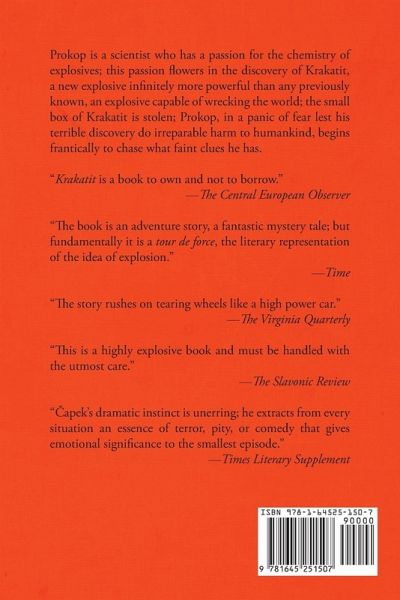 Prokop is a scientist who has a passion for the chemistry of explosives; this passion flowers in the discovery of Krakatit, a new explosive infinitely more powerful than any previously known, an explosive capable of wrecking the world; the small box of Krakatit is stolen; Prokop, in a panic of fear lest his terrible discovery do irreparable harm to humankind, begins frantically to chase what faint clues he has. "Krakatit is a book to own and not to borrow." -The Central European Observer "The book is an adventure story, a fantastic mystery tale; but fundamentally it is a tour de force, the literary representation of the idea of explosion." -Time "The story rushes on tearing wheels like a high power car." -The Virginia Quarterly "This is a highly explosive book and must be handled with the utmost care." -The Slavonic Review "¿apek's dramatic instinct is unerring; he extracts from every situation an essence of terror, pity, or comedy that gives emotional significance to the smallest episode." -Times Literary Supplement