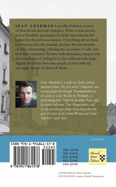Sean Akerman's crisp, evocative voice lays bare vulnerabilities, wonder, and mystery. With deep attention to his characters' psychologies, he creates men and women who linger in your mind long after you finish reading. His novella, Krakow, does just that. A man moves into a Brooklyn apartment and finds the journals left behind by the previous tenants. As he reads the journals, he discovers two people wrestling with why and how their love disappeared. Krakow is set in the present day, amid the streets of Brooklyn. Its concerns will resonate with readers young and old, telling a timeless story of how lovers become strangers. Working in the novella form, Akerman is able to move swiftly over a landscape of heartache and hope. It is this sort of writing that is re-establishing the novella as a potent form of storytelling in contemporary literature. Suitable for all ages, Krakow points to Sean Akerman as a force to be reckoned with in American letters.