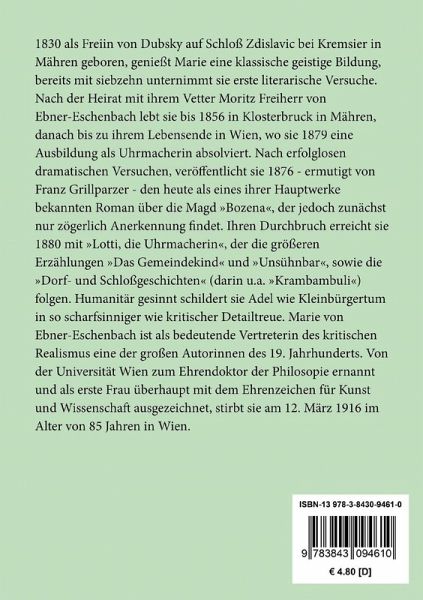 1830 als Freiin von Dubsky auf Schloß Zdislavic bei Kremsier in Mähren geboren, genießt Marie eine klassische geistige Bildung, bereits mit siebzehn unternimmt sie erste literarische Versuche. Nach der Heirat mit ihrem Vetter Moritz Freiherr von Ebner-Eschenbach lebt sie bis 1856 in Klosterbruck in Mähren, danach bis zu ihrem Lebensende in Wien, wo sie 1879 eine Ausbildung als Uhrmacherin absolviert. Nach erfolglosen dramatischen Versuchen, veröffentlicht sie 1876 - ermutigt von Franz Grillparzer - den heute als eines ihrer Hauptwerke bekannten Roman über die Magd "Bozena", der jedoch zunächst nur zögerlich Anerkennung findet. Ihren Durchbruch erreicht sie 1880 mit "Lotti, die Uhrmacherin", der die größeren Erzählungen "Das Gemeindekind" und "Unsühnbar", sowie die "Dorf- und Schloßgeschichten" (darin u.a. "Krambambuli") folgen. Humanitär gesinnt schildert sie Adel wie Kleinbürgertum in so scharfsinniger wie kritischer Detailtreue. Marie vonEbner-Eschenbach ist als bedeutende Vertreterin des kritischen Realismus eine der großen Autorinnen des 19. Jahrhunderts. Von der Universität Wien zum Ehrendoktor der Philosopie ernannt und als erste Frau überhaupt mit dem Ehrenzeichen für Kunst und Wissenschaft ausgezeichnet, stirbt sie am 12. März 1916 im Alter von 85 Jahren in Wien.