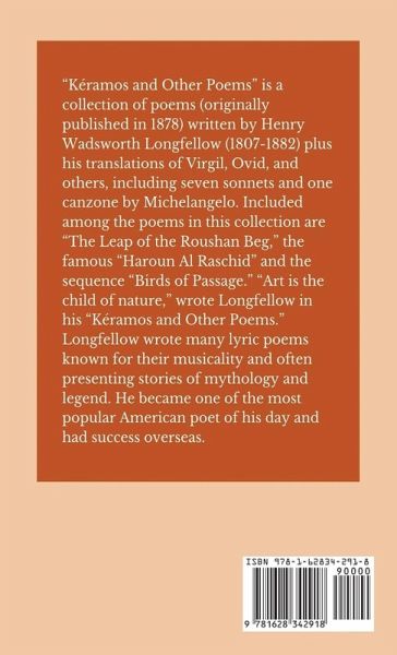 Unique Element * About the Author / Historical Context * A COLLECTION OF POEMS by HENRY WADSWORTH LONGFELLOW. Kéramos and Other Poems, by AMERICAN author HENRY WADSWORTH LONGFELLOW (1807-1882) is a collection of poems first published in 1878 in the UNITED STATES. Longfellow wrote many lyric poems known for their musicality and often presenting stories of mythology and legend. He was among the most popular American poet of his day and had success overseas. This volume contains some original poems by Longfellow, as well as his translations of Virgil, Ovid, and others, including seven sonnets and one canzone by Michelangelo. Included among the poems in this collection are "The Leap of the Roushan Beg," the famous "Haroun Al Raschid" and the sequence "Birds of Passage: Flight the Fifth." "Art is the child of nature," wrote the American poet Henry Wadsworth Longfellow in his book of poetry, Kéramos and Other Poems. Sneak Peak Art is the child of Nature; yes, Her darling child, in whom we trace The features of the mother's face, Her aspect and her attitude, All her majestic loveliness Chastened and softened and subdued Into a more attractive grace, And with a human sense imbued. Title Details * Originally published in 1878