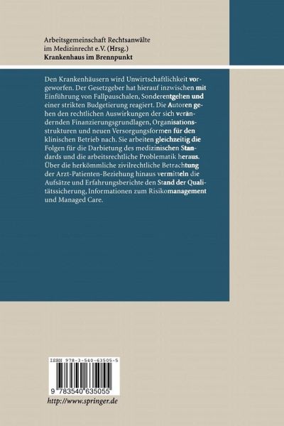 Den Krankenhäusern wird Unwirtschaftlichkeit vorgeworfen. Der Gesetzgeber hat hierauf inzwischen mit Einführung von Fallpauschalen, Sonderentgelten und einer strikten Budgetierung reagiert. Die Autoren gehen den rechtlichen Auswirkungen der sich verändernden Finanzierungsgrundlagen, Organisationsstrukturen und neuen Versorgungsformen für den klinischen Betrieb nach. Sie arbeiten gleichzeitig die Folgen für die Darbietung des medizinischen Standards und die arbeitsrechtliche Problematik heraus. Über die herkömmliche zivilrechtliche Betrachtung der Arzt-Patienten-Beziehung hinaus vermitteln die Aufsätze und Erfahrungsberichte den Stand der Qualitätssicherung, Informationen zum Risikomanagement und Managed Care.