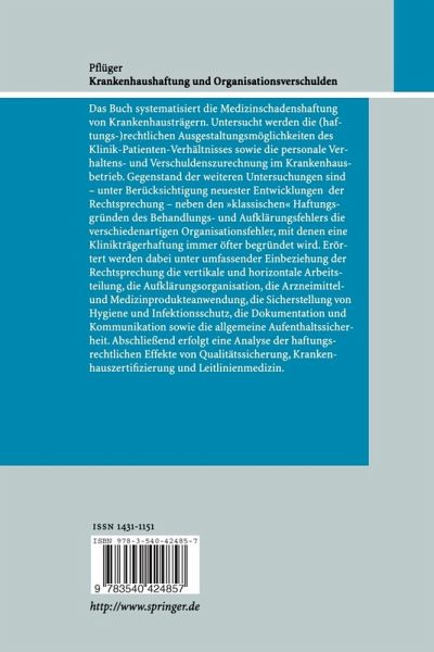 Gang der Untersuchung.- I. Kapitel: Tatsächliche Grundlagen.- 1 Medizinschäden in Krankenhäusern.- 2 Aufbau und innere Struktur von Krankenhäusern.- 2. Kapitel: Systematik der Krankenhaushaftung.- 3 Haftung wegen Vertragsverletzung.- 4 Haftung wegen unerlaubter Handlung.- 5 Formularmäßige Haftungsbeschränkung.- 6 Innenverhältnis - Regress, Freistellung und Versicherung.- 3. Kapitel: Erscheinungsformen ärztlichen Fehlverhaltens im Krankenhaus.- 7 Klinische Behandlungsfehler.- 8 Klinische Aufklärungsfehler - Eine kritische Bestandsaufnahme.- 4. Kapitel: Fehler der Krankenhausorganisation im Spiegel der Rechtsprechung.- 9 Personaleinsatz und Personalüberwachung (vertikale Arbeitsteilung).- 10 Interdisziplinäre ärztliche Zusammenarbeit (horizontale Arbeitsteilung).- 11 Organisation der Patientenaufklärung.- 12 Anwendung von Arzneimitteln, insbesondere Blut und Blutprodukten.- 13 Einsatz von Medizinprodukten.- 14 Hygiene und Infektionsschutz.- 15 Medizinische Kommunikation (Dokumentation, Information) 206.- 16 Allgemeine Aufenthaltssicherheit.- 5. Kapitel: Rechtliche Signifikanz der Organisationsfehlerhaftung.- 17 Haftungskonzentration auf den Krankenhausträger.- 18 Leichtere Feststellung organisatorischer Standards.- 19 Anknüpfung von Beweiserleichterungen; rechtliche Einordnung des Organisationsverschuldens.- 6. Kapitel: Auswirkungen von Qualitätssicherung und Zertifizierung auf die Haftung 261.- 20 Praktische Qualitätssicherung im Krankenhaus.- 21 Qualitätssicherung durch Leitlinien.- Zusammenfassung der wesentlichen Inhalte und Ergebnisse.- Literatur.- Sachverzeichnis 343.