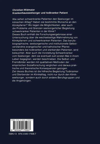 Schwerkranke Patienten begegnen im Krankenhaus nicht nur Ärzten und Schwestern, sondern auch einer Vielzahl anderer Berufsgruppen, so auch dem Seelsorger. Wie sehen sie ihn im klinischen Alltag? Haben sie bestimmte Wünsche an den Klinikpfarrer? Wo liegen die Möglichkeiten, aber auch die Probleme und Grenzen seelsorgerlicher Begleitung schwerkranker Patienten in der Klinik? Dieses Buch enthält die Forschungsergebnisse einer Untersuchung über die wechselseitige Wahrnehmung von Klinikpfarrern und schwerkranken Patienten. Das berufsbiographische, seelsorgerische und institutionelle Selbstverständnis evangelischer und katholischer Pfarrer, besonders bei todkranken und sterbenden Patienten, wird beleuchtet. Aber auch die Vorstellungen Schwerkranker vom Seelsorger, dem sie eventuell zum ersten Mal in ihrem Leben begegnen, werden beschrieben. Die Selbst- und Fremdbilder werden mit qualitativen Methoden der empirischen Sozialforschung verglichen und daraus praktische und theoretische Konsequenzen gezogen. Diese Untersuchung gibt zusätzlich einen Einblick in die historische Entwicklung der Krankenhausseelsorge und vermitttelt einen Überblick über die wenigen zu diesem Thema im In- und Ausland vorliegenden Arbeiten. Ziel dieses Buches ist die hilfreiche Begleitung Todkranker und Sterbender im Klinikalltag, nicht nur durch den Klinikseelsorger, sondern auch durch andere Berufsgruppen und die Angehörigen.