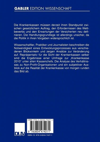 Wissenschaftler, Praktiker und Journalisten beschreiben die Notwendigkeit eines Entwicklungsprozesses aus verschiedenen Blickwinkeln und zeigen Ansätze zur Veränderung auf. Repräsentativ für die Sicht der Krankenkassen selber sind die Ergebnisse einer Umfrage zur "Krankenkasse 2010" unter allen Kassenchefs. Die Analyse des Verhältnisses zu Non-Profit-Organisationen und ein subjektiver Ausblick auf die Realität der Krankenkasse von morgen runden das Bild ab.