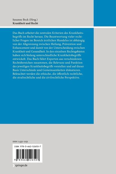 Teil I Die ethische Perspektive: Thomas Schramme, Gesundheit und Krankheit in der philosophischen Perspektive.- Orsolya Friedrich und Sebastian Schleidgen, Das Verhältnis von Normalität und Normativität im Bereich der Psyche.- Teil II Die öffentlich-rechtliche Perspektive: Stefan Huster, Die Bedeutung des Krankheitsbegriffs für das Krankenversicherungsrecht.- Wolfram Küntzel, Die Bedeutung des Krankheitsbegriffs für das Steuerrecht.- Ulf Doepner, Krankheitsbegriff im Arznei- und Heilmittelwerberecht - Relevanz und Kriterien.- Teil III Die strafrechtliche Perspektive: Susanne Beck, Krankheitsbegriff im Kontext der Körperverletzungsdelikte.- Benno Zabel, Der Krankheitsbegriff des 20 StGB. Entwicklungen im Spannungsfeld von Psychiatrie, Philosophie und Strafrecht.- Teil IV Die zivilrechtliche Perspektive: Volker Lipp, Krankheit und Autonomie im Zivilrecht.- Hartmut Oetker, Implikationen des arbeitsrechtlichen Krankheitsbegriffs.- Andreas Spickhoff, Der Krankheitsbegriff im (Privat-) Versicherungsrecht.