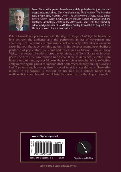 Peter Ebsworth is a poet in love with the stage. In Krapp's Last Tape, he treads the line between the audience and the performer, an act of voyeurism and ventriloquism that results in tense snippets of verse only relieved by a tongue in cheek humour that is evident throughout. In his persona poems, he embodies a pantheon of pop culture gods and goddesses such as Marlon Brando, Sticky Vicky, the veteran Benidorm erotic entertainer, and Tony Soprano; in other poems he turns the gaze around to observe them as audience. Selected from literary output ranging over 30 years the tone swings from bullish to reflective, aptly mirroring the gamut of emotions that performers embody on stage. Krapp's Last Tape remains, however, firmly rooted in side stage drama - Ebsworth's interest in Pythagoras is focused on his role as a soldier rather than mathematician, and his girl has a lobster tattoo in place of the dragon of myth.