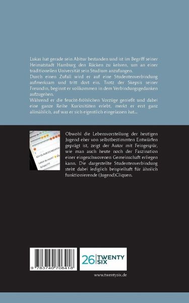 Lukas hat gerade sein Abitur bestanden und ist im Begriff, seiner Heimatstadt Hamburg den Rücken zu kehren, um an einer traditionellen Universität sein Studium anzufangen. Durch einen Zufall wird er auf eine Studentenverbindung aufmerksam und tritt dort ein. Trotz der Skepsis seiner Freundin, beginnt er vollkommen in dem Verbindungsgedanken aufzugehen.Während er die feucht-fröhlichen Vorzüge genießt und dabei eine ganze Reihe Kuriositäten erlebt, merkt er erst ganz allmählich, auf was er sich eigentlich eingelassen hat ...Der Roman lässt den Leser die Entwicklung des Protagonisten plausibel nachvollziehen. Obwohl die Gegenwart der heutigen Jugend eher von individuell-egozentrischen Lebensentwürfen bestimmt wird, zeigt der Autor mit Feingespür, wie ein Einzelner auch heute noch der Faszination einer eingeschworenen Gemeinschaft erliegen kann. Die dargestellte fiktive Studentenverbindung steht dabei lediglich beispielhaft für ähnlich funktionierende Organisationen. Anhand dieser Jugendclique wird vorgeführt, wie von Mitgliedern ein Übermaß an Selbstaufgabe verlangt wird, wenn man Teil einer Gemeinschaft sein möchte, die sich einen bedingungslosen Zusammenhalt auf die sprichwörtliche Fahne geschrieben hat. Der unterhaltsam-humoristische Stil lässt den Leser die erlegene Begeisterung des Protagonisten live miterleben. Auch dadurch sorgen die geschilderten Episoden nicht selten für ein Schmunzeln - wenn auch auf ganz unterschiedliche Art.