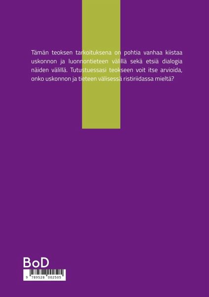 Tämän teoksen tarkoituksena on pohtia vanhaa kiistaa uskonnon ja luonnontieteen välillä sekä etsiä dialogia näiden välillä. Tutustuessasi teokseen voit itse arvioida, onko uskonnon ja tieteen välisessä ristiriidassa mieltä?