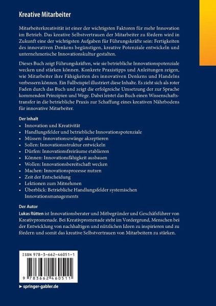Dieses Buch zeigt Führungskräften, wie sie betriebliche Innovationspotenziale wecken und stärken können. Konkrete Praxistipps und Anleitungen zeigen, wie Mitarbeiter ihre Fähigkeiten des innovativen Denkens und Handelns verbessern können. Ein Fallbeispiel illustriert diese Inhalte. Es zieht sich als roter Faden durch das Buch und zeigt die erfolgreiche Umsetzung der zur Sprache kommenden Prinzipien und Wege. Dabei leistet das Buch einen Wissenschaftstransfer in die betriebliche Praxis zur Schaffung eines kreativen Nährbodens für innovative Mitarbeiter.