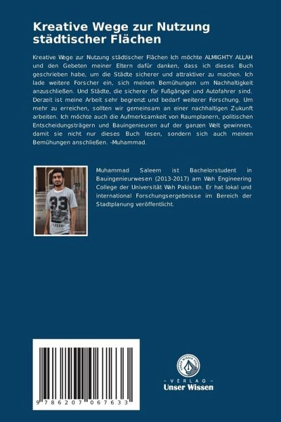 Kreative Wege zur Nutzung städtischer Flächen Ich möchte ALMIGHTY ALLAH und den Gebeten meiner Eltern dafür danken, dass ich dieses Buch geschrieben habe, um die Städte sicherer und attraktiver zu machen. Ich lade weitere Forscher ein, sich meinen Bemühungen um Nachhaltigkeit anzuschließen. Und Städte, die sicherer für Fußgänger und Autofahrer sind. Derzeit ist meine Arbeit sehr begrenzt und bedarf weiterer Forschung. Um mehr zu erreichen, sollten wir gemeinsam an einer nachhaltigen Zukunft arbeiten. Ich möchte auch die Aufmerksamkeit von Raumplanern, politischen Entscheidungsträgern und Bauingenieuren auf der ganzen Welt gewinnen, damit sie nicht nur dieses Buch lesen, sondern sich auch meinen Bemühungen anschließen. -Muhammad.