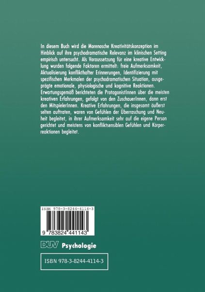 I. Theoretische Annäherung an den Begriff 'Kreativität'.- 1. Begriffsbestimmung.- 2. Historische Einordnung der Kreativitätsforschung.- 3. Vier Aspekte der Kreativitätsthematik.- 4. Kreativität als universales Konzept (J.L. Moreno).- 5. Zusammenfassung.- II. Empirische Untersuchungen zur Kreativitätsthematik.- 1. Allgemeine Probleme in der Psychotherapieforschung.- 2. Spezielle Schwierigkeiten in der Psychodramaforschung.- 3. Eigener Forschungsansatz.- III. Ratschläge an die Psychodrama-LeiterInnen und die Teilnehmerinnen.- 1. Aufforderungen an die Teilnehmerinnen.- 2. Neun Aufforderungen an die Psychodrama-Leiterlnnen.- IV. Theoretische Einordnung der Ergebnisse aus den Untersuchungen I und II.- V. Zusammenfassung.- Das Kategoriensystem.- Verzeichnis der Originaldaten, Formblätter und weiteren Materialien, die im Psychologischen Institut IV der WWU Münster, Fliednerstr. 21 hinterlegt sind.- Literatur.