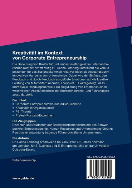 Die Bedeutung von Kreativität und Innovationsfähigkeit im unternehmerischen Kontext nimmt stetig zu. Carina Lomberg untersucht die Voraussetzungen für das Zustandekommen kreativer Ideen als Ausgangspunkt innovativen Handelns von Unternehmen. Dabei wird der Einfluss, den Feedback und durch Feedback ausgelöste Emotionen auf die kreative Leistung von Mitarbeitern nehmen, analysiert. Es wird gezeigt, dass individuelle Handlungskontrolle zur Regulierung von Emotionen einen wesentlichen Aspekt innerhalb der Entrepreneurship- und Führungsprozesse darstellt.