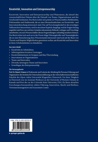 Kreativität im Arbeitsleben.- Selbstregulation kreativer Leistungen.- Kreativitätsbarrieren in Gruppen und ihre Überwindung.- Innovationen in Organisationen.- Teams und Innovation.- Diversity, heterogene Teams und Innovation.- Grundlagen des Entrepreneurship.