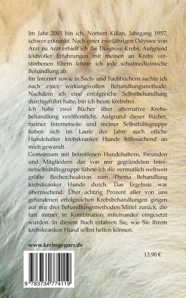 Nachdem Norbert Kilian eine erfolgreiche Selbstbehandlung seiner Krebserkrankung durchgeführt hatte, veröffentlichte er Anfang 2010 seine Erfahrungen in dem Buch "Krebs? Nur noch als Sternzeichen!". Zwei Jahre später folgte der Ratgeber "Krebs? Die Kilian Methode". Eine Anleitung zur Selbsthilfe, basierend auf den Erfahrungen, die er und andere Betroffene, unter anderem aus der von ihm geleiteten Selbsthilfegruppe, gesammelt haben. Aufgrund seiner Bücher und seiner Internetseite haben sich im Laufe der Jahre auch etliche Hundehalter krebskranker Hunde hilfesuchend an ihn gewandt. Selbst ein großer Hundefreund, entschloss sich Norbert Kilian im Sommer 2012, ein Buch über die Krebsbehandlung von Hunden zu schreiben.Gemeinsam mit betroffenen Hundehaltern, Freunden und Mitgliedern mehrerer Selbsthilfegruppen entstand die vermutlich weltweit größte Rechercheaktion zu diesem Thema. Dutzende von Freiwilligen suchten im Internet, in Zeitschriften und Fachpublikationen nach erfolgreichen Behandlungsfällen. Die Suche umfasste auch den englischen, spanischen und französischen Sprachraum.Das Ergebnis war überraschend. Über achtzig Prozent aller gefundenen erfolgreichen Krebsbehandlungen gingen auf nur drei Behandlungsmethoden/Mittel zurück, die fast immer in Kombination miteinander eingesetzt wurden. In diesem Buch erfahren Sie, wie Sie Ihrem krebskranken Hund selbst helfen können. Die Aktualisierung ist erforderlich geworden, weil mein Wissen über die Krebsbehandlung von Hunden in den letzten Jahren stark gewachsen ist, größtenteils durch Leser meiner Bücher, die mir mitgeteilt haben, was sie erfolgreich, oft zusätzlich zu meinen Vorschlägen eingesetzt haben.