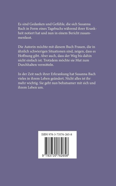 Es sind Gedanken und Gefühle, die sich Susanna Bach in Form eines Tagebuchs während ihrer Krankheit notiert hat und nun in einem Bericht zusammenfasst. Die Autorin möchte mit diesem Buch Frauen, die in ähnlich schwierigen Situationen sind, zeigen, dass es Hoffnung gibt. Aber auch, dass der Weg bis dahin nicht einfach ist. Trotzdem möchte sie Mut zum Durchhalten vermitteln.In der Zeit nach ihrer Erkrankung hat Susanna Bach vieles in ihrem Leben geändert. Nicht alles ist ihr mehr wichtig. Sie geht nun behutsamer mit sich und ihrem Leben um.