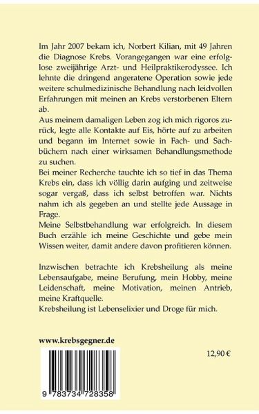 Im Jahr 2007 bekam ich, Norbert Kilian, mit 49 Jahren die Diagnose Krebs. Vorangegangen war eine erfolglose zweijährige Arzt- und Heilpraktikerodyssee. Ich lehnte die dringend angeratene Operation sowie jede weitere schulmedizinische Behandlung nach leidvollen Erfahrungen mit meinen an Krebs verstorbenen Eltern ab. Aus meinem damaligen Leben zog ich mich rigoros zurück, legte alle Kontakte auf Eis, hörte auf zu arbeiten und begann im Internet sowie in Fach- und Sachbüchern nach einer wirksamen Behandlungsmethode zu suchen.Bei meiner Recherche tauchte ich so tief in das Thema Krebs ein, dass ich völlig darin aufging und zeitweise sogar vergaß, dass ich selbst betroffen war. Nichts nahm ich als gegeben an und stellte jede Aussage in Frage. Meine Selbstbehandlung war erfolgreich. In diesem Buch erzähle ich meine Geschichte und gebe mein Wissen weiter, damit andere davon profitieren können.Viele Krebspatienten werden ihre eigenen Gedanken und Gefühle wiederfinden. Es ist mir gelungen, ein informatives, ehrliches, flott zu lesendes, Mut machendes Buch zuschreiben. Inzwischen sind fünf Jahre vergangen. Nun habe ich das Buch überarbeitet. Der Originaltext wurde nicht verändert. Ich habe meine neuen Erkenntnisse und Gedanken hinter das jeweilige Kapitel gestellt.Heute betrachte ich Krebsheilung als meine Lebensaufgabe, meine Berufung, mein Hobby, meine Leidenschaft, meine Motivation, meinen Antrieb, meine Kraftquelle. Krebsheilung ist Lebenselixier und Droge für mich.