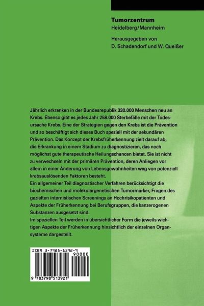 Zielsetzung des Tumorzentrums Heidelberg/Mannheim ist neben der Erarbeitung von Richtlinien für eine verstärkte standardisierte Diagnostik, Therapie und Nachsorge und deren Anwendung in der Praxis, die Förderung von Maßnahmen zur Früherkennung. Dieser Band aus der Schriftenreihe des Tumorzentrums ist nunmehr aktualisiert und stark erweitert worden.
