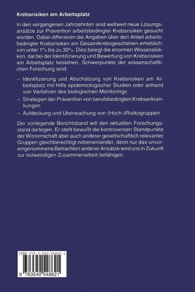 Krebsrisiken am Arbeitsplatz - die Antwort der Betriebe.- Eine Problemanalyse aus Unternehmenssicht.- Vorstellungen zum arbeitsmedizinischen Beanspruchungsmonitoring.- Lösung arbeitsmedizinischer Probleme durch Betriebe und Universitäten - Beispiel Vinylchlorid.- Krebsrisiken am Arbeitsplatz - Aufgabe und Herausforderung für das überbetriebliche Arbeitsschutzsystem.- Expositionsermittlung und Meßdatendokumentation: Grundsteine für Prävention, Epidemiologie und Rehabilitation (Mit 1 Abbildung).- Beiträge der Bundesanstalt für Arbeitsschutz zur Verringerung der Krebsrisiken am Arbeitsplatz (Mit 1 Abbildung).- Krebsrisiken in der Arbeitsumwelt-Forderungen der Gewerkschaften an die Arbeitsschutzpolitik und -praxis.- Die Problematik arbeitsbedingter Krebserkrankungen aus gewerkschaftlicher Sicht.- Wissenschaftliche Erkenntnisse zur Risikoabschätzung.- Grundlagen der epidemiologischen Erforschung von Berufskrankheiten (Mit 1 Abbildung).- Was läuft - was läuft nicht in der Berufskrebsepidemiologie in Deutschland?.- The Use of National Cancer Registers for Causality Studies and Prevention of Work-Related Cancer.- Screening for Occupational Bladder Cancer: An Historical Perspective with Implications for Future Research (Mit 3 Abbildungen).- Zur Problematik der Risikoextrapolation am Beispiel von Dichlormethan (Methylenchlorid) (Mit 2 Abbildungen).- Die Verwendung der alkalischen Filterelution zur Detektion genschädigender Belastungen am Arbeitsplatz (Mit 6 Abbildungen).- Analysen zum erhöhten Krebsrisiko für ausgewählte Tätigkeitsgruppen und anerkannte Berufskrebse im Gebiet der neuen Bundesländer (Mit 1 Abbildung).- Die individuelle Prävention - Aufgabe und Perspektiven der klinischen Arbeitsmedizin, Toxikologie und Gefahrstoffanalytik.-Krebsrisiken am Arbeitsplatz: Zur Situation der klinischen Arbeitsmedizin (Mit 16 Abbildungen).- Forschungsstand zur kollektiven und individuellen Risikoabschätzung (Mit 4 Abbildungen).- Karzinogene chlorierte aliphatische Kohlenwasserstoffe: Möglichkeiten des Biomonitorings und Risikobewertung (Mit 7 Abbildungen).- Untersuchungen zur quantitativen Beziehung zwischen dem Benzo(a)pyrengehalt und der Gesamtkanzerogenität von Emissionen im Tierversuch (Mit 8 Abbildungen).- Biological Monitoring als diagnostisches Instrument bei der Prävention chemischbedingter Berufskrebse (Mit 3 Abbildungen).- Vorkommen von Nitrosaminen in der Gummiindustrie: Prävention durch Safe-amine-Beschleuniger (Mit 6 Abbildungen).