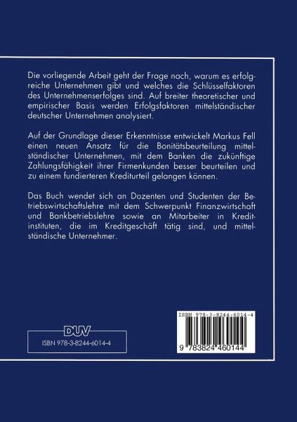 A Einleitung.- 1 Ausgangssituation.- 2 Problemstellung.- 3 Gang der Untersuchung.- B Definitorische Abgrenzungen.- 1 Das mittelständische Unternehmen.- 2 Zum Begriff der Erfolgsfaktoren.- 3 Rentabilität und Wachstum als Komponenten des wirtschaftlichen Erfolges.- C Grundlegende Annahmen zu den Erfolgsfaktoren mittelständischer Unternehmen.- 1 Einleitende Vorbemerkungen zur Vorgehensweise.- 2 Die Wettbewerbsstrategie als externer Erfolgsfaktor.- 3 Erfassung interner Erfolgsfaktoren entlang der Wertschöpfungskette ("value chain").- D Empirische Überprüfung der Erfolgsfaktoren mittelständischer Unternehmen.- 1 Aufbau der empirischen Untersuchung.- 2 Die angewendeten statistischen Verfahren und die bei der Datenauswertung erzielten Ergebnisse.- 3 Kritische Würdigung der Vorgehensweise und der Ergebnisse der empirischen Untersuchung.- E Ansatzpunkte zur Kreditwürdigkeitsprüfung auf Basis der Erfolgsfaktoren mittelständischer Unternehmen.- 1 Derzeitiger Stand und kritische Würdigung der Kreditwürdigkeitsprüfung durch Banken.- 2 Das Prognoseproblem bei der Kreditwürdigkeitsprüfung.- 3 Entwicklung eines Bonitätsbeurteilungssystems unter Einbezug der Erfolgsfaktoren mittelständischer Unternehmen.- F Zusammenfassung und Ausblick.